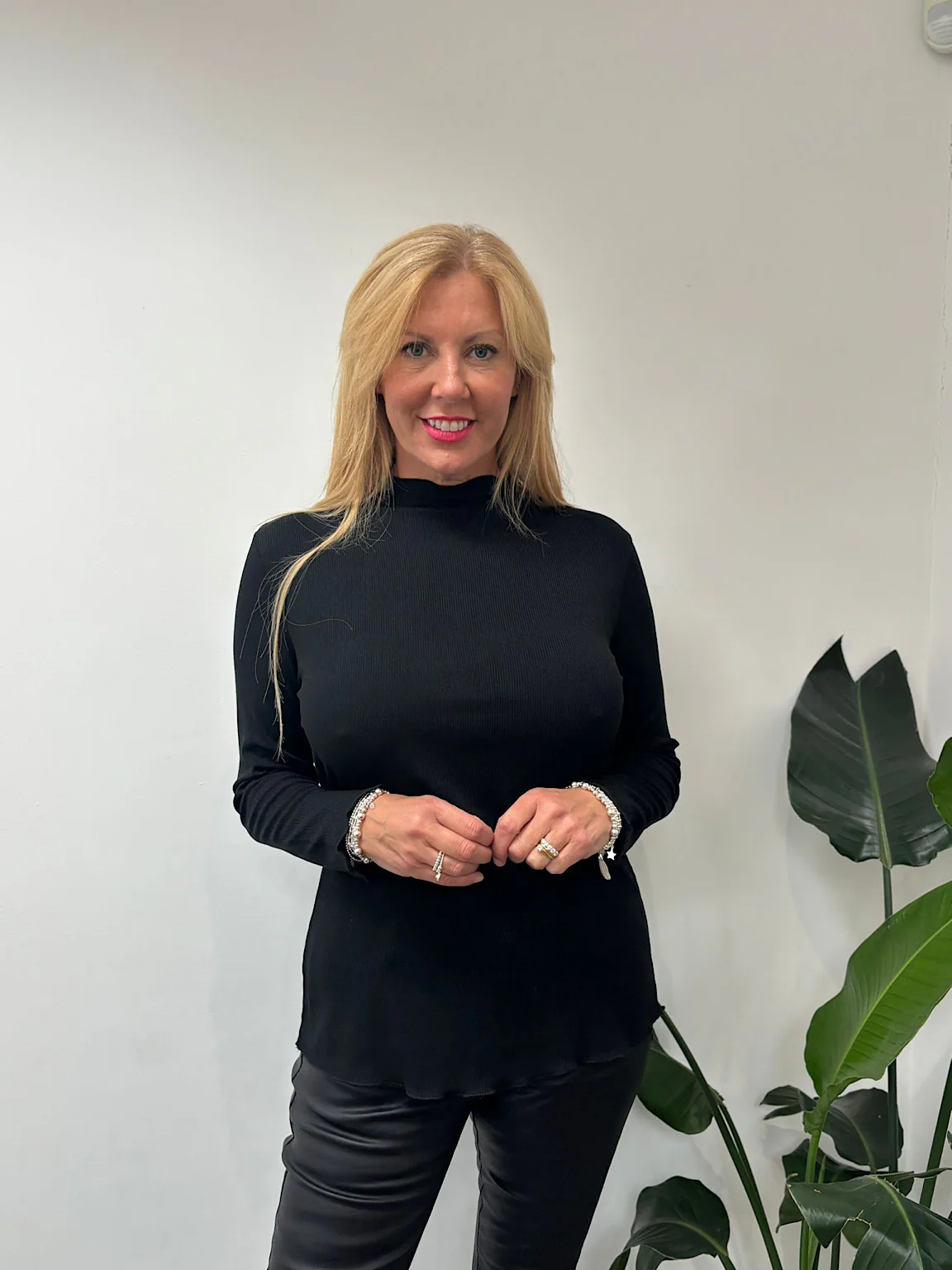 This Ribbed Flute Neck Top Charlotte features a flattering flute design around the neckline and a fine ribbed texture, giving it a smart and sophisticated look. With long sleeves, this top is perfect for any occasion. Elevate your style with this must-have addition to your wardrobe.