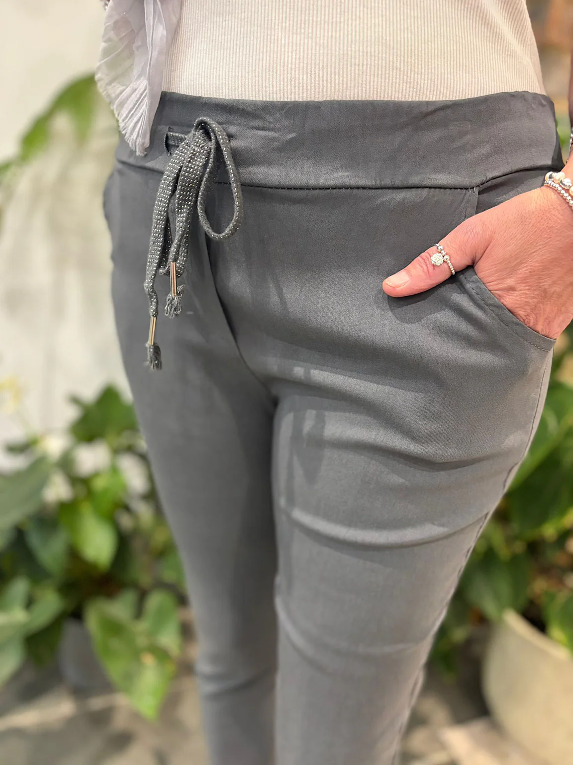 These Magic Trousers are perfect for staycations, holidays or even just going out walking with the dog. Available in a variety of colours, they are super stretchy, comfortable and have a lurex detail drawstring. If you would like a looser boyfriend style fit then we recommend going for the size up.