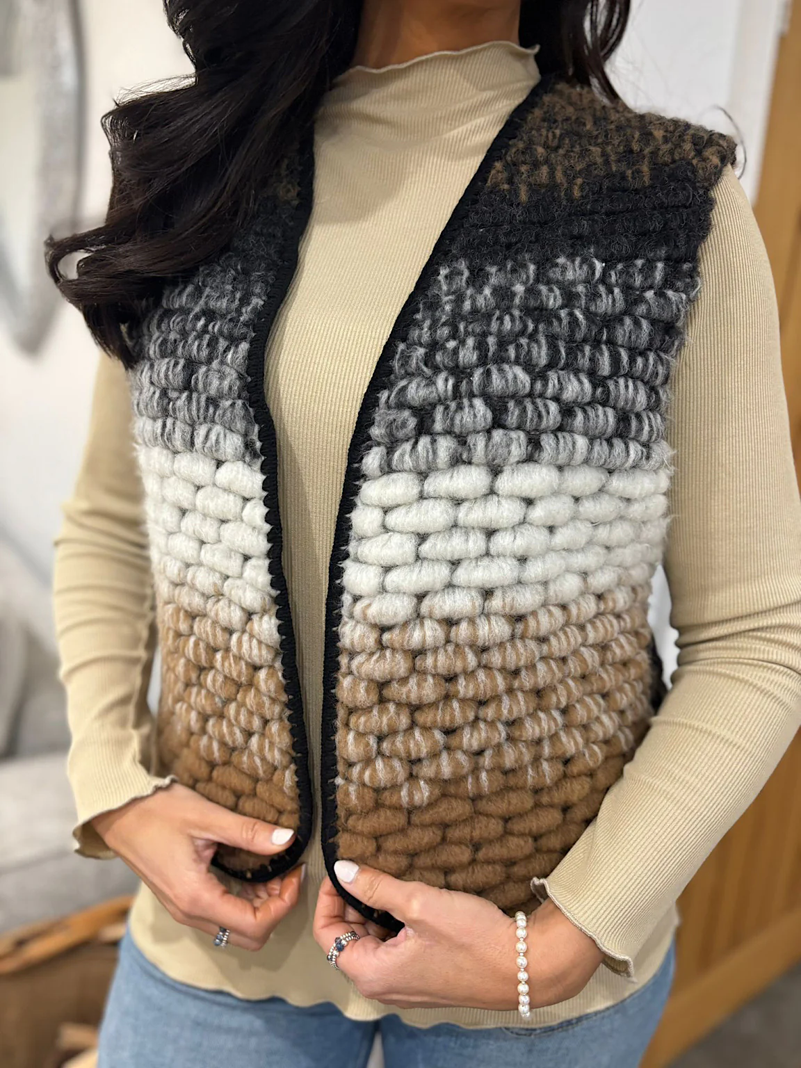 Wrap yourself in cosy comfort with this Ombre Knitted Stripe Gilet, crafted from a sumptuous wool blend featuring a soft, chunky weave. The textured fabric creates wonderful depth and visual interest, while the ombre effect adds a touch of contemporary flair. Perfect for layering over your favourite tops, this gilet delivers warmth without the bulk, making it an effortless way to elevate any outfit. Ideal for those who love tactile, quality knitwear with personality.