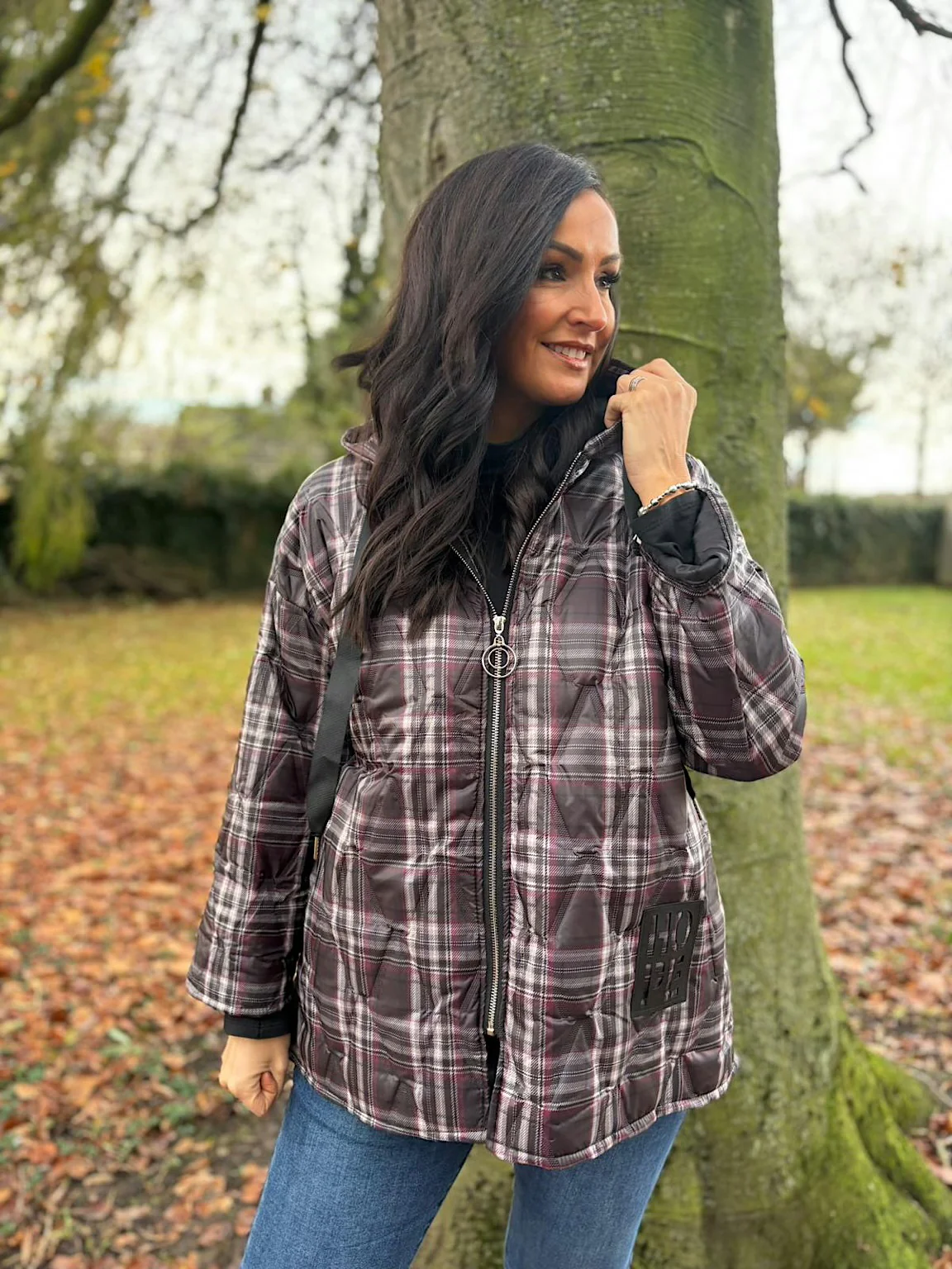 The Quilted Coat Clover combines timeless tartan styling with practical warmth. This quilted coat features a distinctive faux leather 'hope' patch and convenient ribbon drawstring, giving you both character and functionality. Perfect for layering through cooler months, it's designed to keep you comfortable while adding a touch of classic charm to your everyday wardrobe.