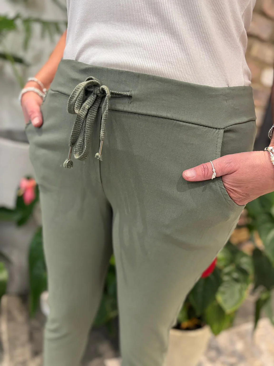 These Magic Trousers are perfect for staycations, holidays or even just going out walking with the dog. Available in a variety of colours, they are super stretchy, comfortable and have a lurex detail drawstring. If you would like a looser boyfriend style fit then we recommend going for the size up.