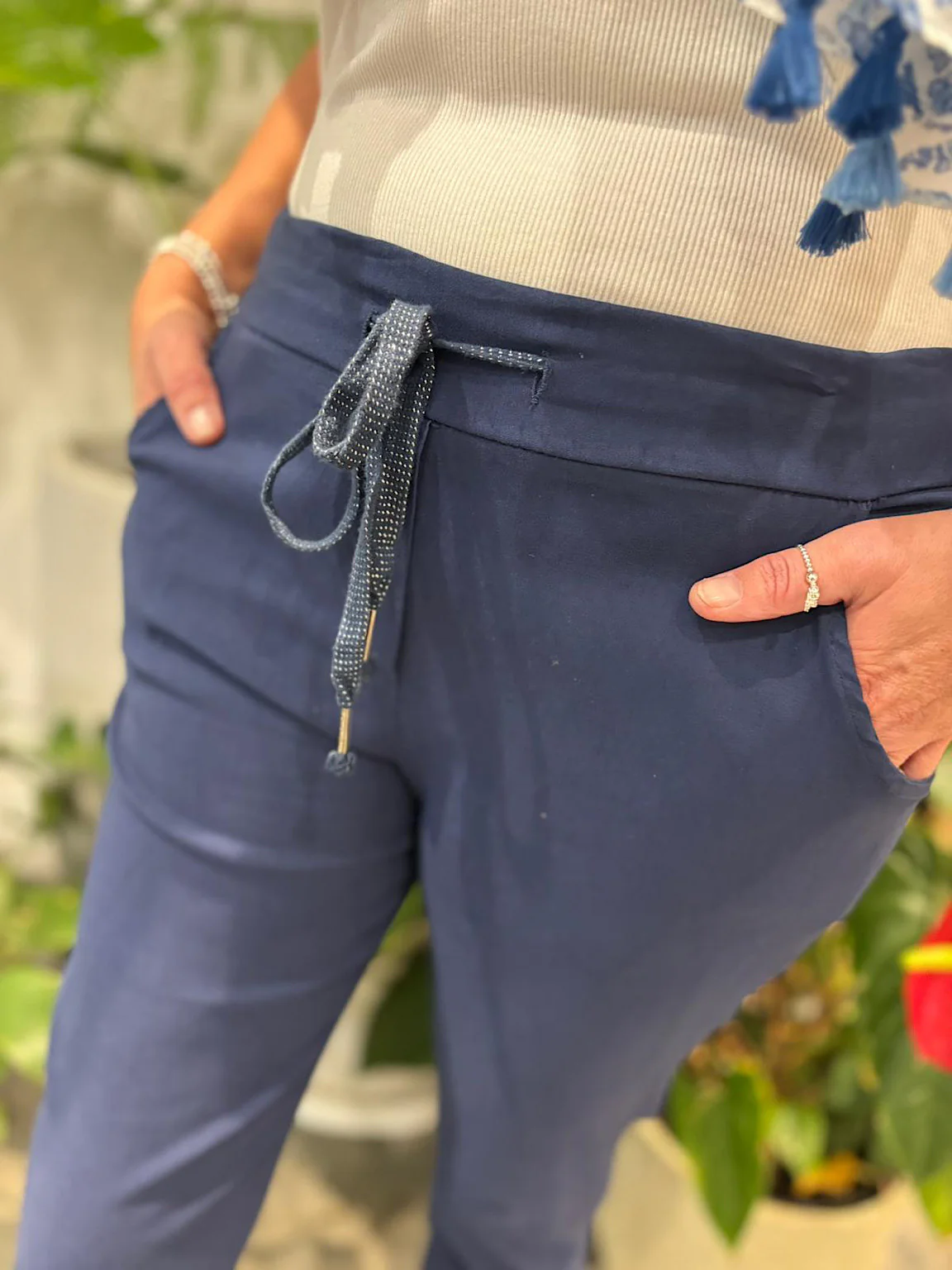 These Magic Trousers are perfect for staycations, holidays or even just going out walking with the dog. Available in a variety of colours, they are super stretchy, comfortable and have a lurex detail drawstring. If you would like a looser boyfriend style fit then we recommend going for the size up.