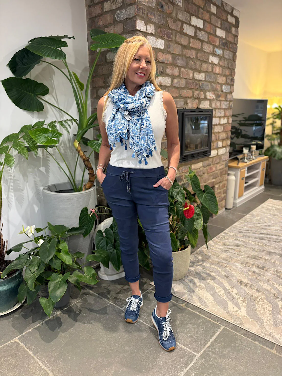 These Magic Trousers are perfect for staycations, holidays or even just going out walking with the dog. Now available in a camo print...they are super stretchy, comfortable and have a lurex detail drawstring. If you would like a looser boyfriend style fit then we recommend going for the size up.