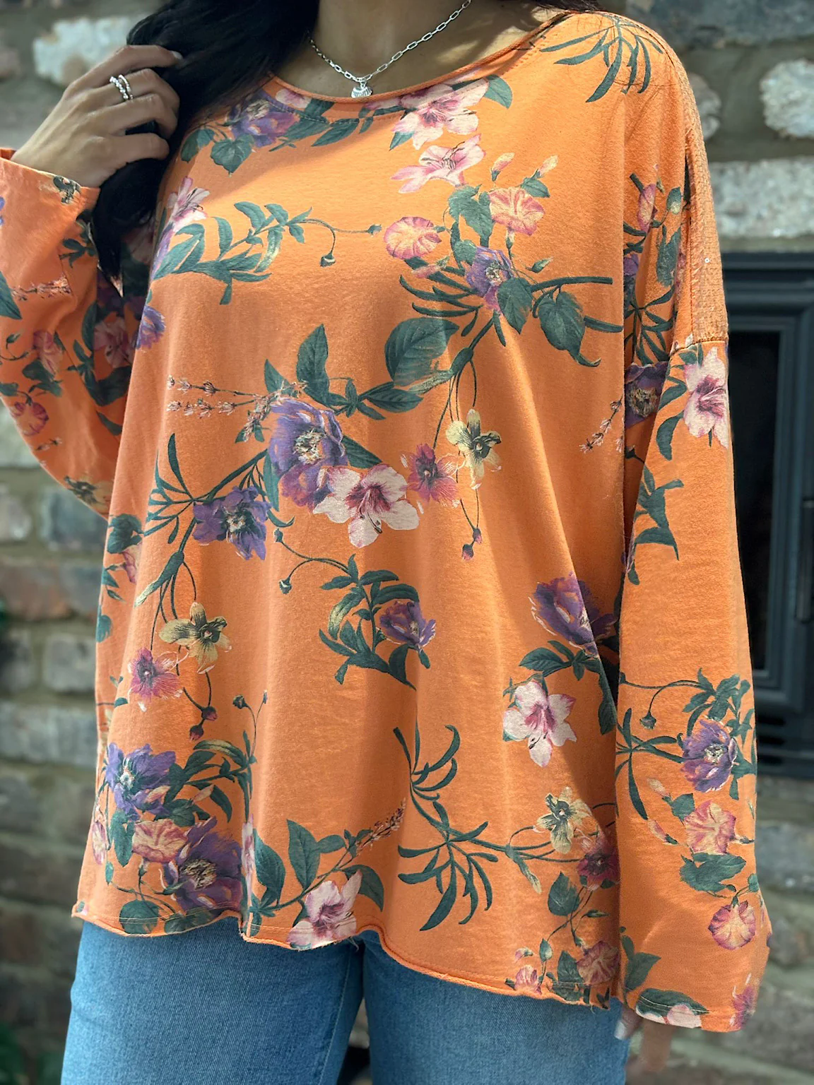 Orange Floral Sequin Detail Top Summer Make a statement this season with our vibrant orange floral top, designed to catch the light and turn heads. Delicate sequin detailing adorns the top arm, adding just the right amount of sparkle to elevate your everyday look. The relaxed drop hem and long sleeves offer a flattering silhouette that works beautifully for both casual outings and warm-weather gatherings. Perfect for layering or wearing solo, this piece brings effortless style and a pop of colour to your summer wardrobe.