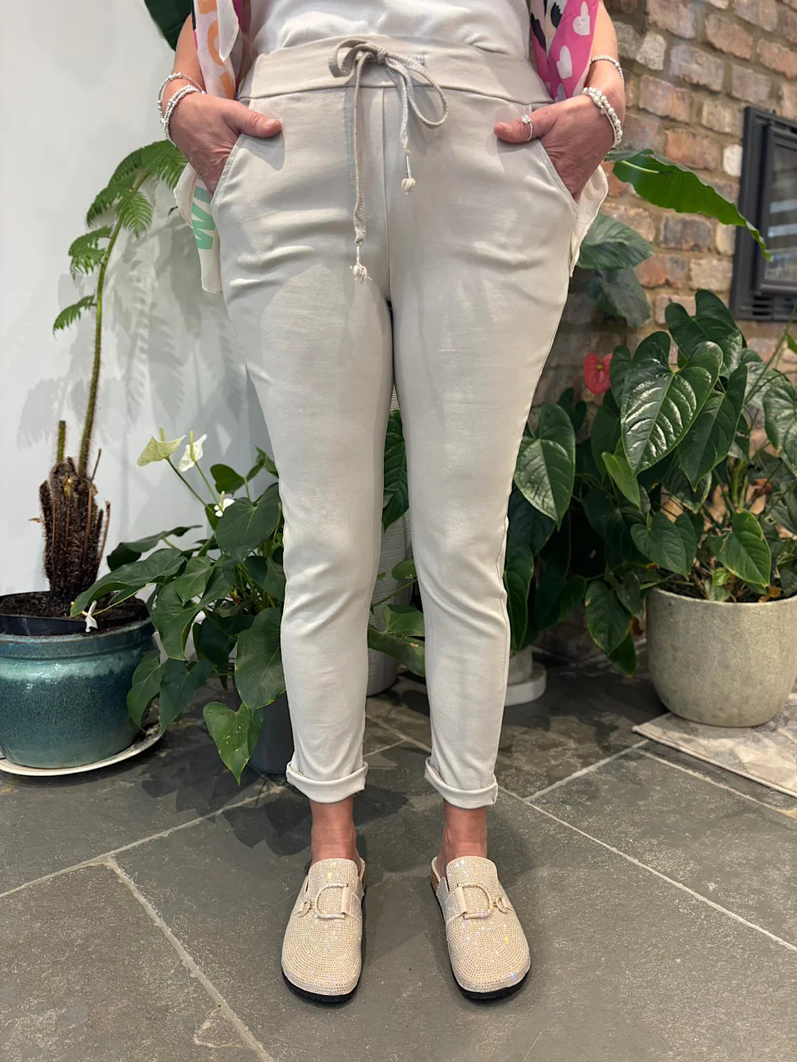 These Magic Trousers are perfect for staycations, holidays or even just going out walking with the dog. Available in a variety of colours, they are super stretchy, comfortable and have a lurex detail drawstring. If you would like a looser boyfriend style fit then we recommend going for the size up.