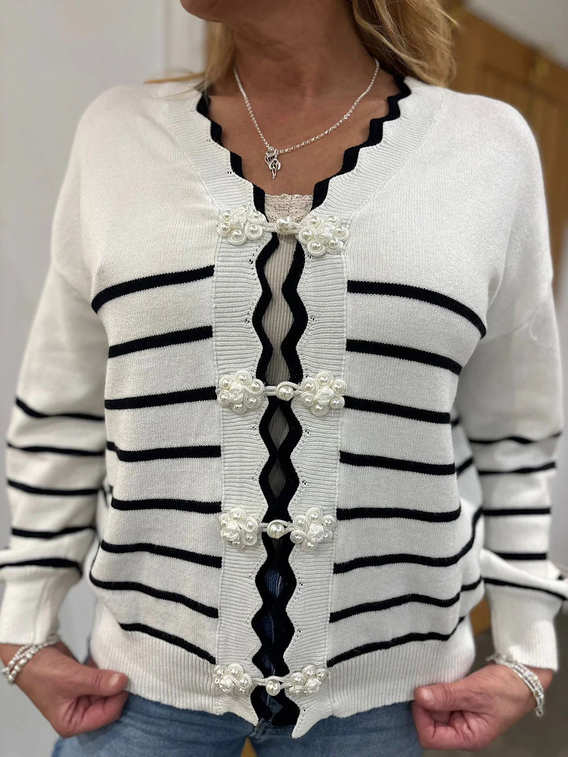 Scalloped Edge Striped Cardi Clara Elevate your everyday wardrobe with this charming striped cardigan, designed to bring effortless style to any occasion. Featuring delicate scalloped edges that add a touch of feminine elegance, this piece is finished with pearl detail buttons that catch the light beautifully. The classic striped pattern works seamlessly with your existing pieces, while the supportive fit ensures you'll feel confident and comfortable all day long. Perfect for layering over dresses or pairing with your favourite jeans, this versatile cardi is a wardrobe essential that deserves a place in your collection.